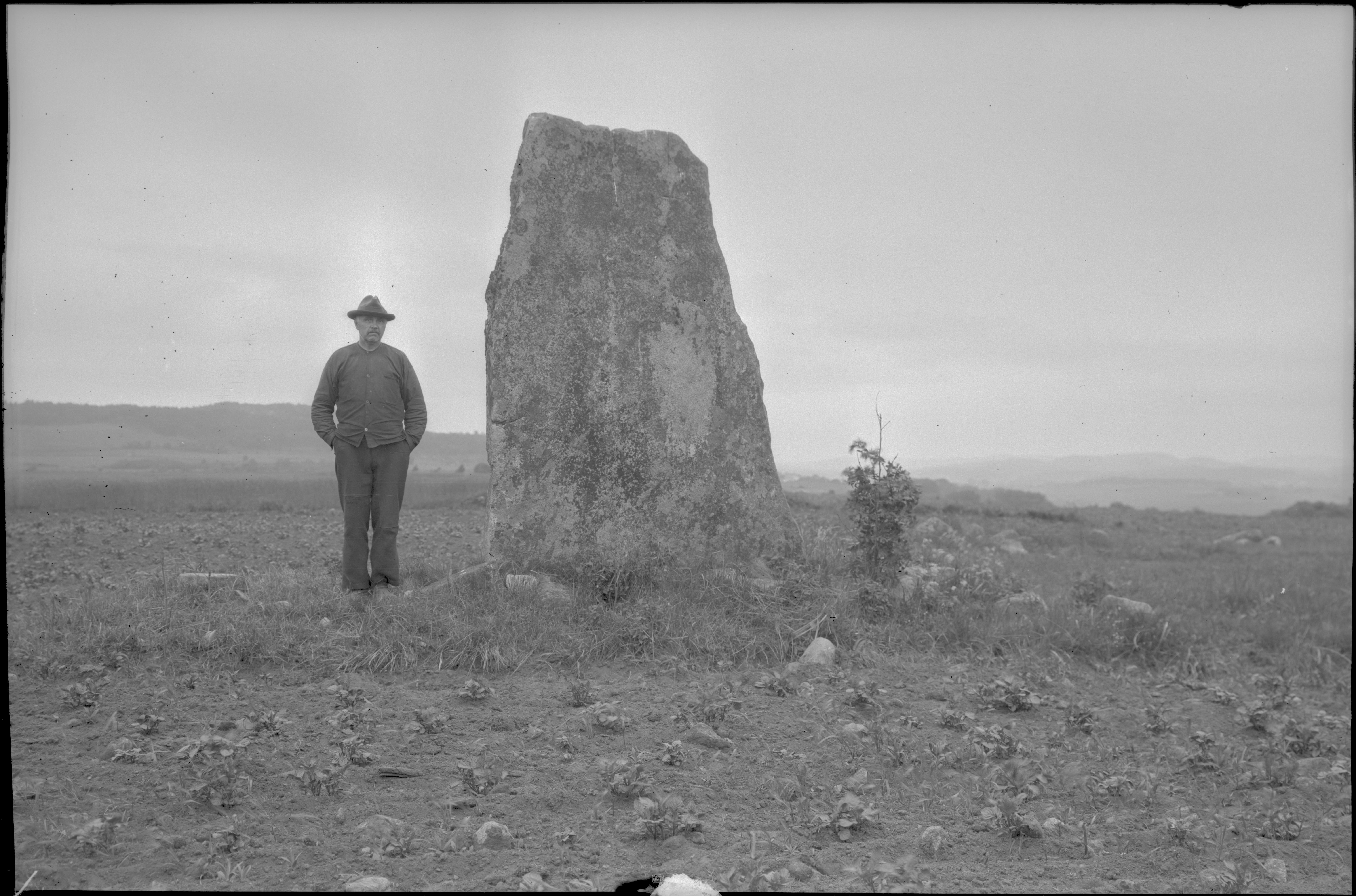 RAÄ-nummer Eftra 13:1. Rest sten i stenpackning; 2,7 meter hög och 2 meter bred vid basen. Person/man bredvid stenen.