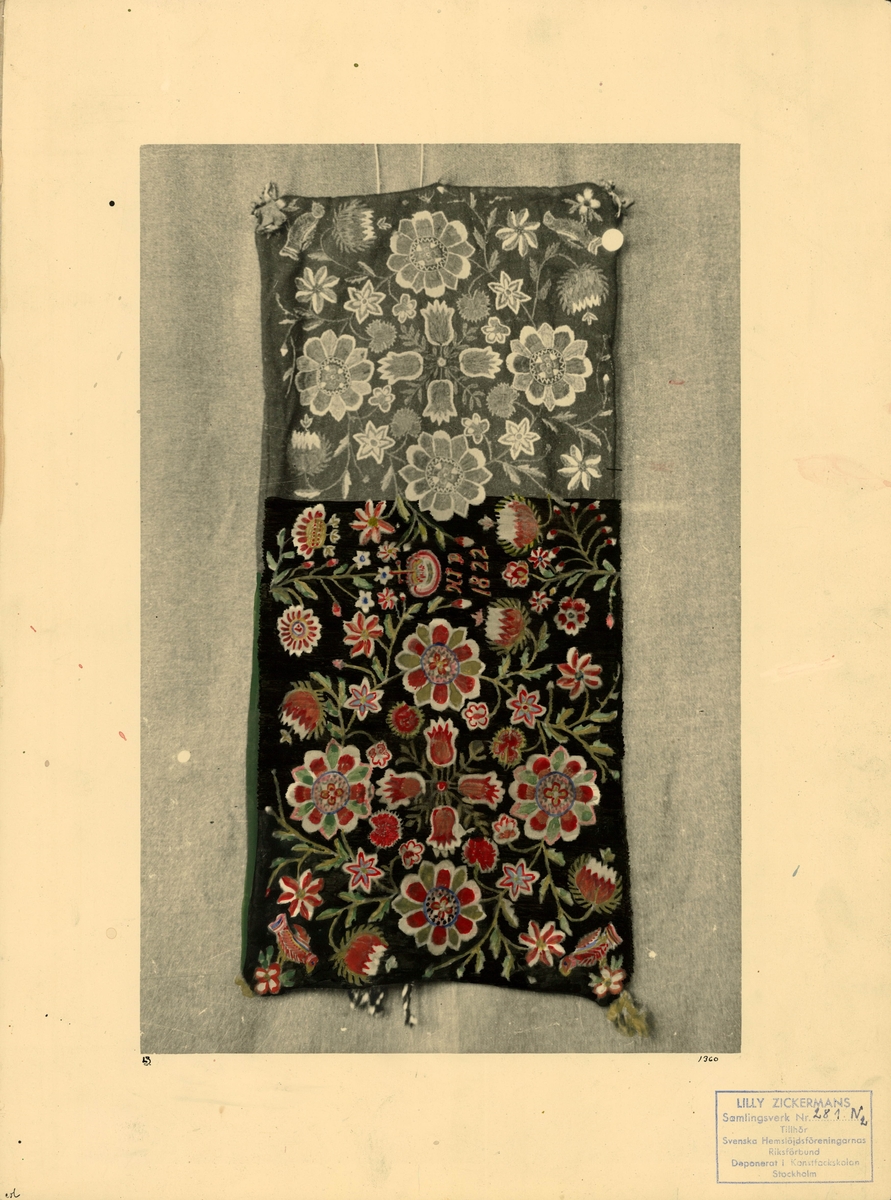 Titel: Vagnsdyna med fritt broderi, yllebroderi.