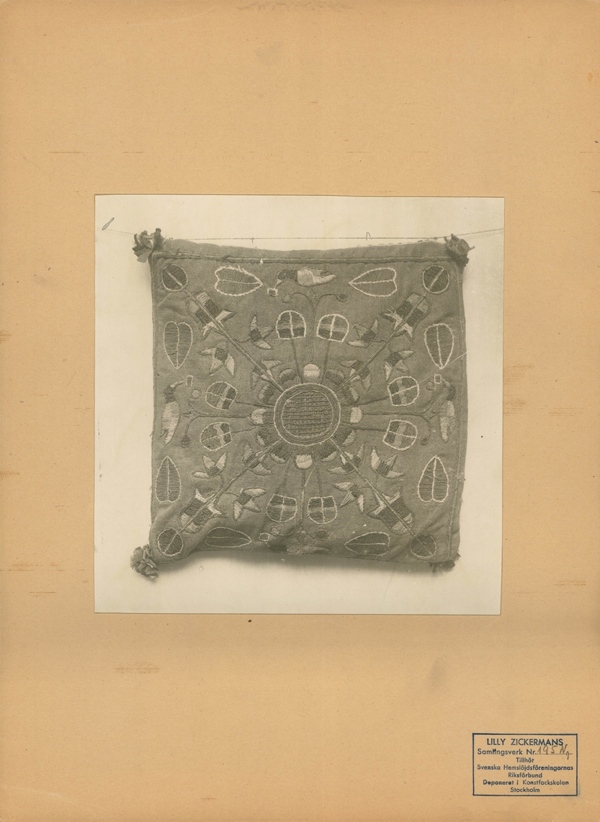 Kudde med fritt broderi.