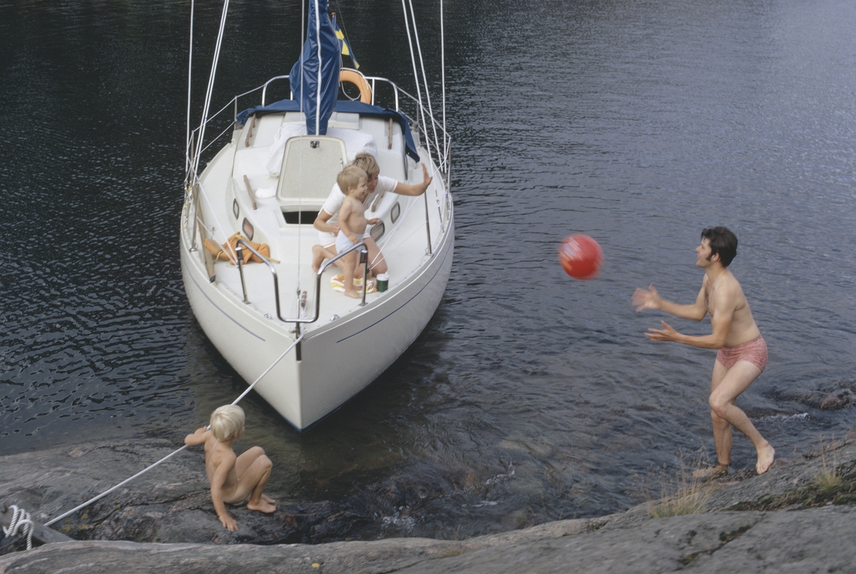 Albin Vega förtöjd vid klippa, barnfamilj leker med badboll. Marknadsföringbild.