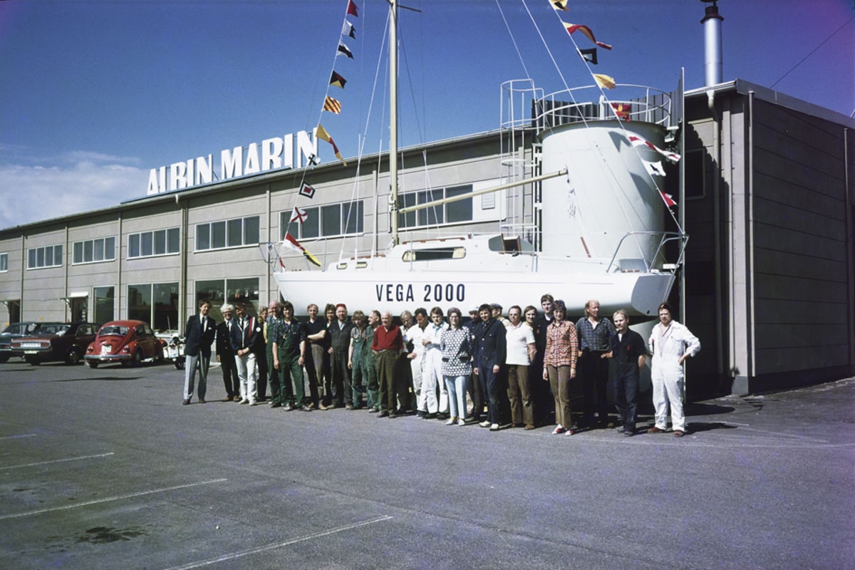 Titel: Albin Vega nummer 2000 utanför Albin Marins monteringsfabrik i Kristinehamn.