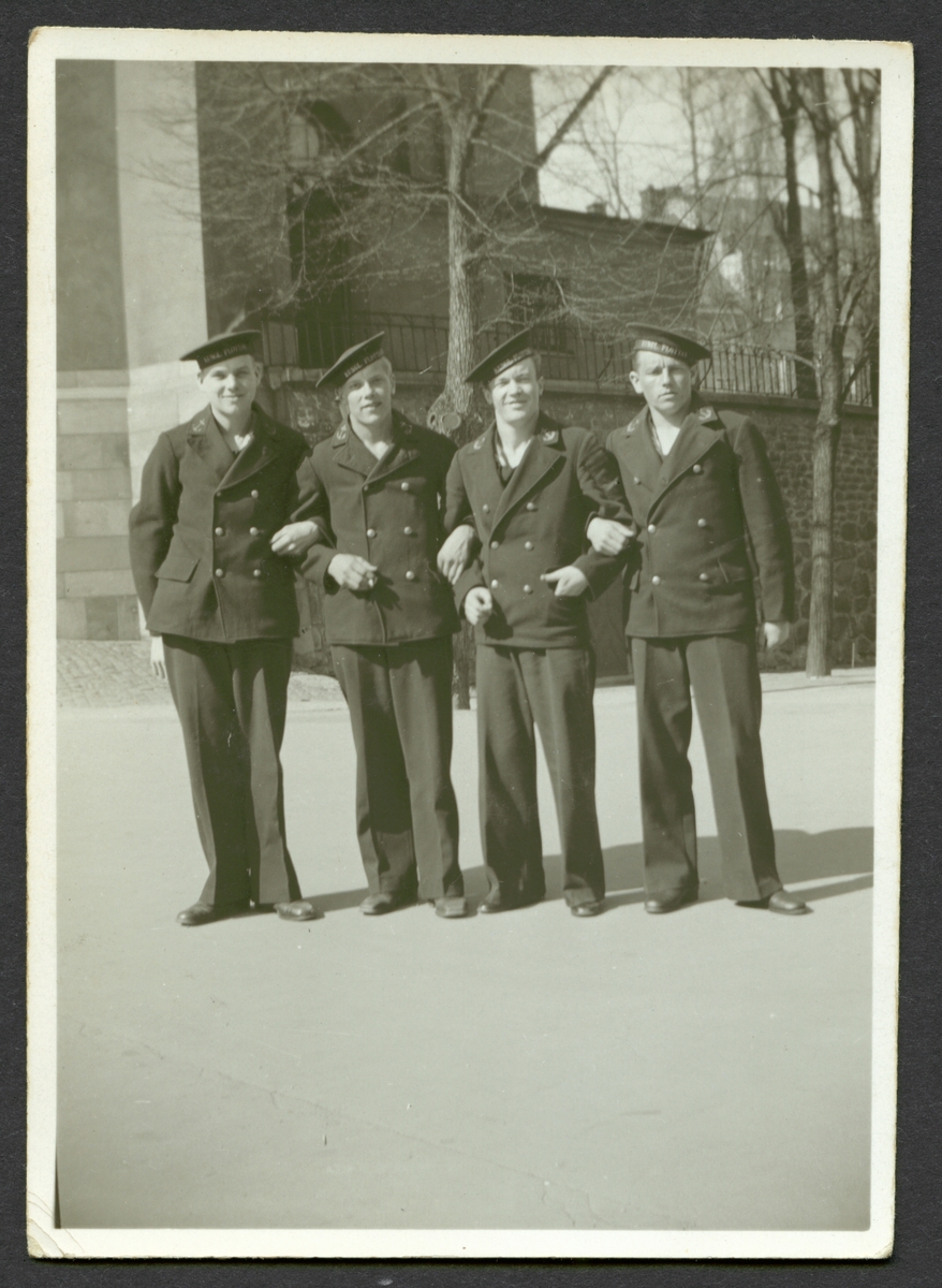 Bilden föreställer fyra sjömän som står uppställt för en gruppfoto i Kungsträdgården under sin permission.