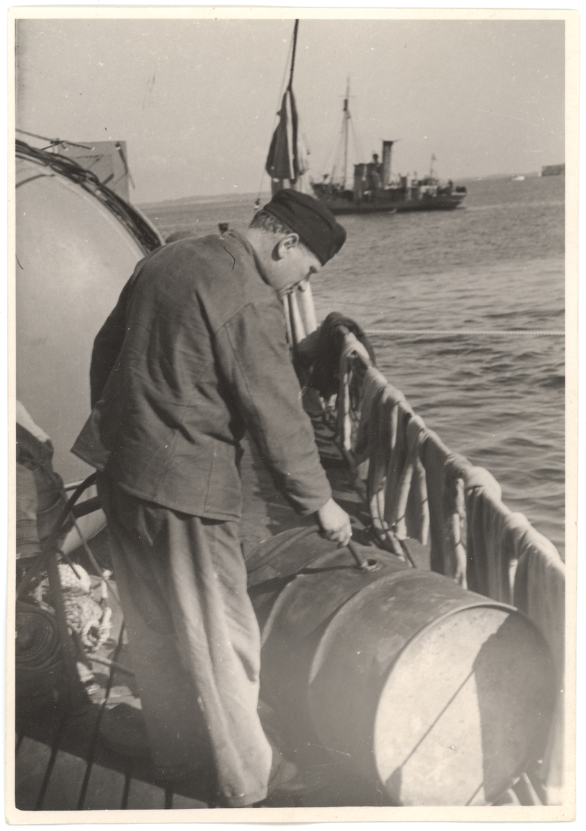 Uppbördsmaskinisten flaggmaskinist Erlingstam bärgar syntetisk dieselmotorolja från U 3505.
