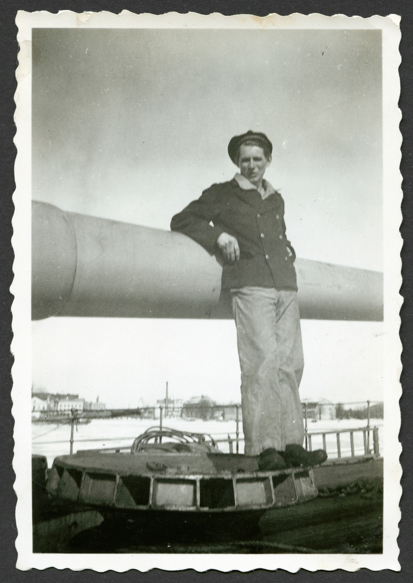 Bilden visar en sjöman som lutar sig mot en kanon på däck av ett örlogsfartyg. I bakgrunden syns Stumholmen.