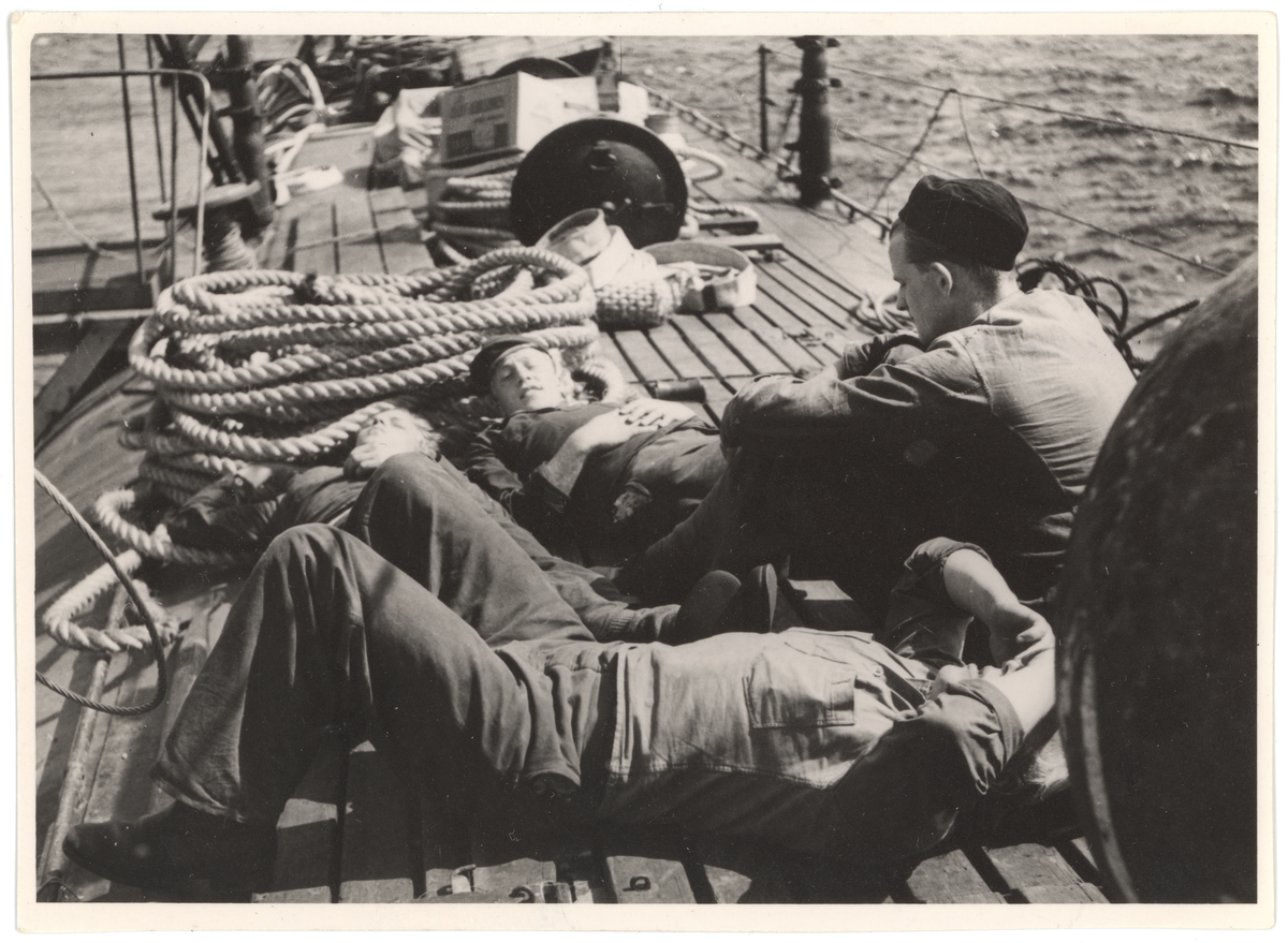 Bilden visar fyra sjömän som tar en paus ombord på Draken under bärgningen av tyska ubåten U 3503.
