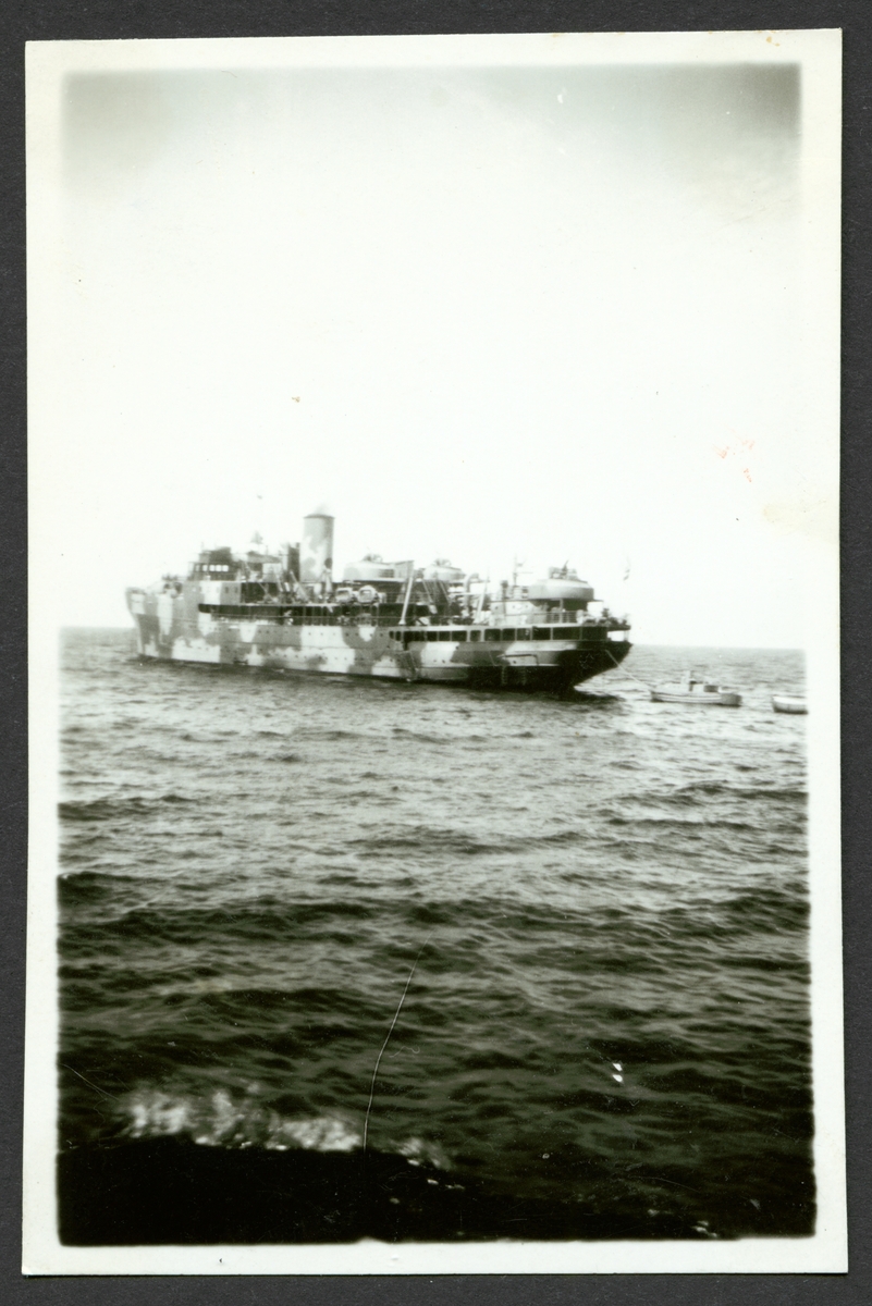 Bilden visar ett örlogsfartyg med maskeringsmålning till sjöss.