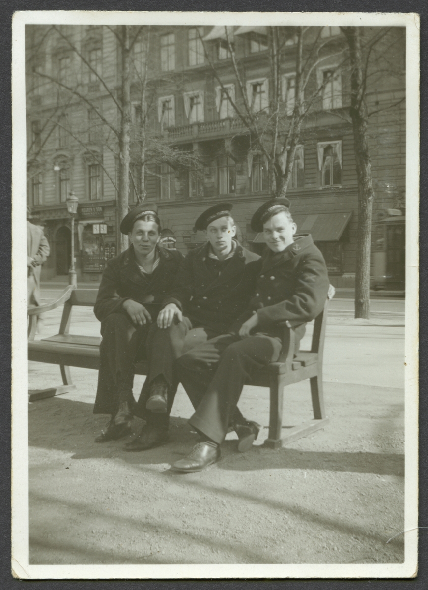 Bilden visar tre sjömän som sitter på en bänk i Kungsträdgården under en utflykt i staden.