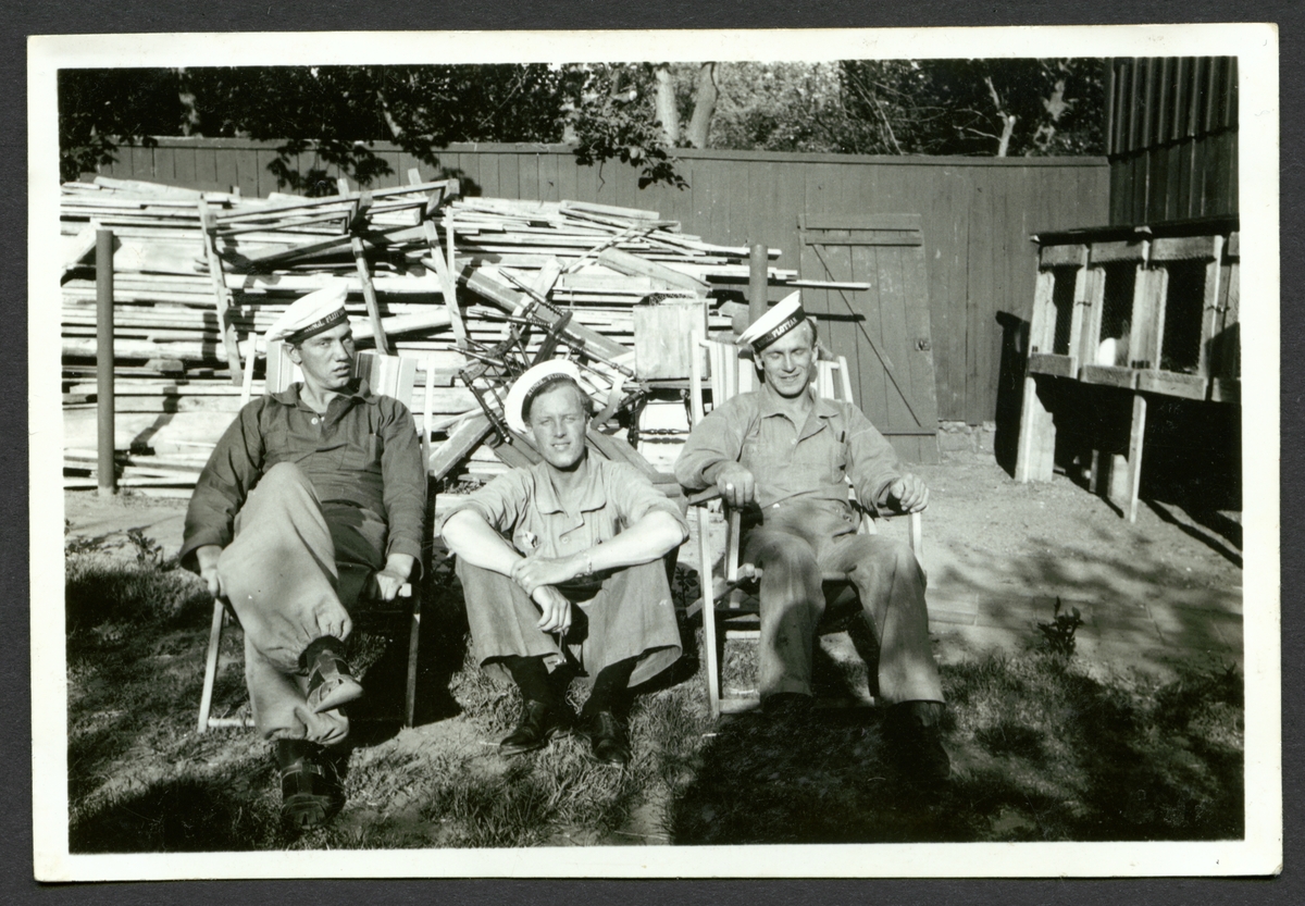 Bilden visar tre sjömän som sitter i solen i en gård.