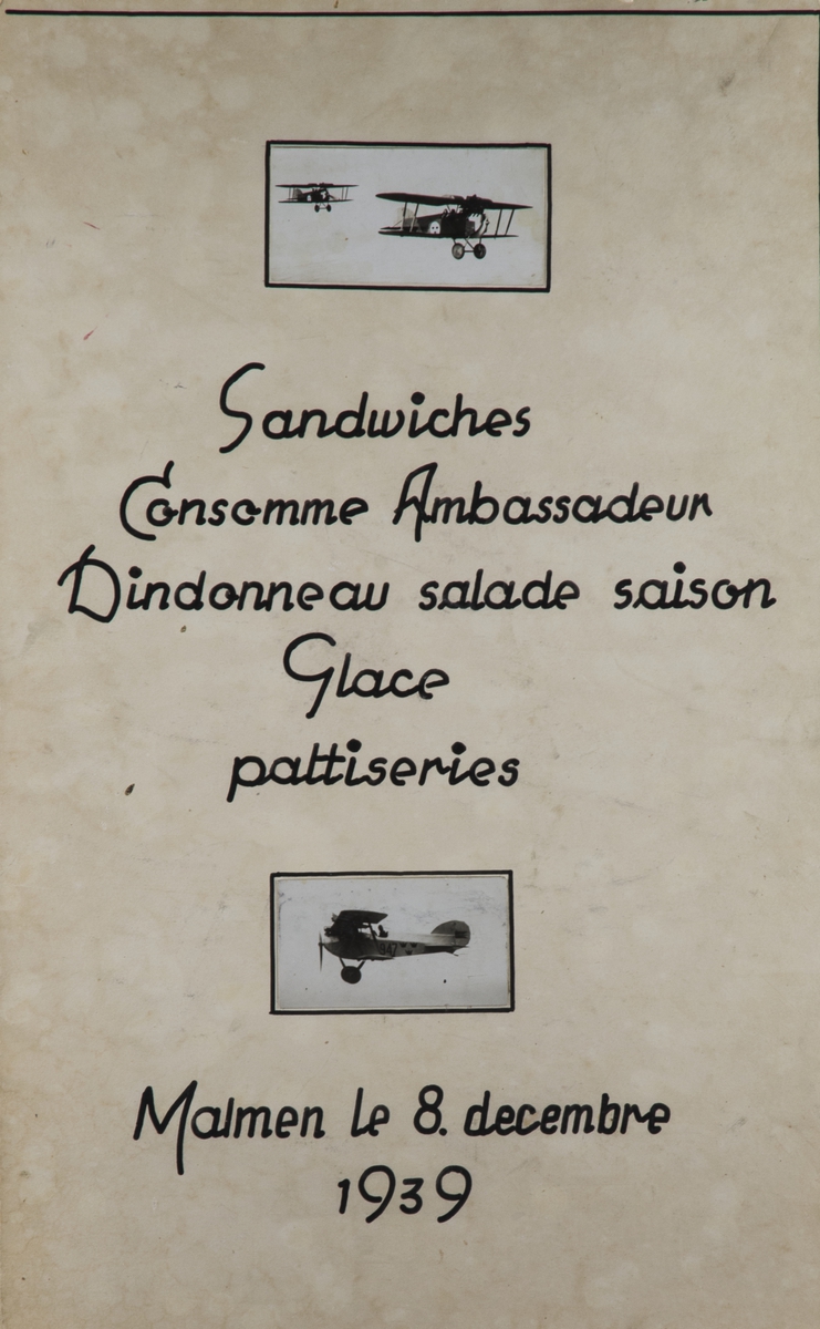 Affisch. F 3 Malmen 8 december 1939. Bildkollage med text. Meny för försäljning på franska. Fotografier av flygplan. Motiv på båda sidor av affischen.