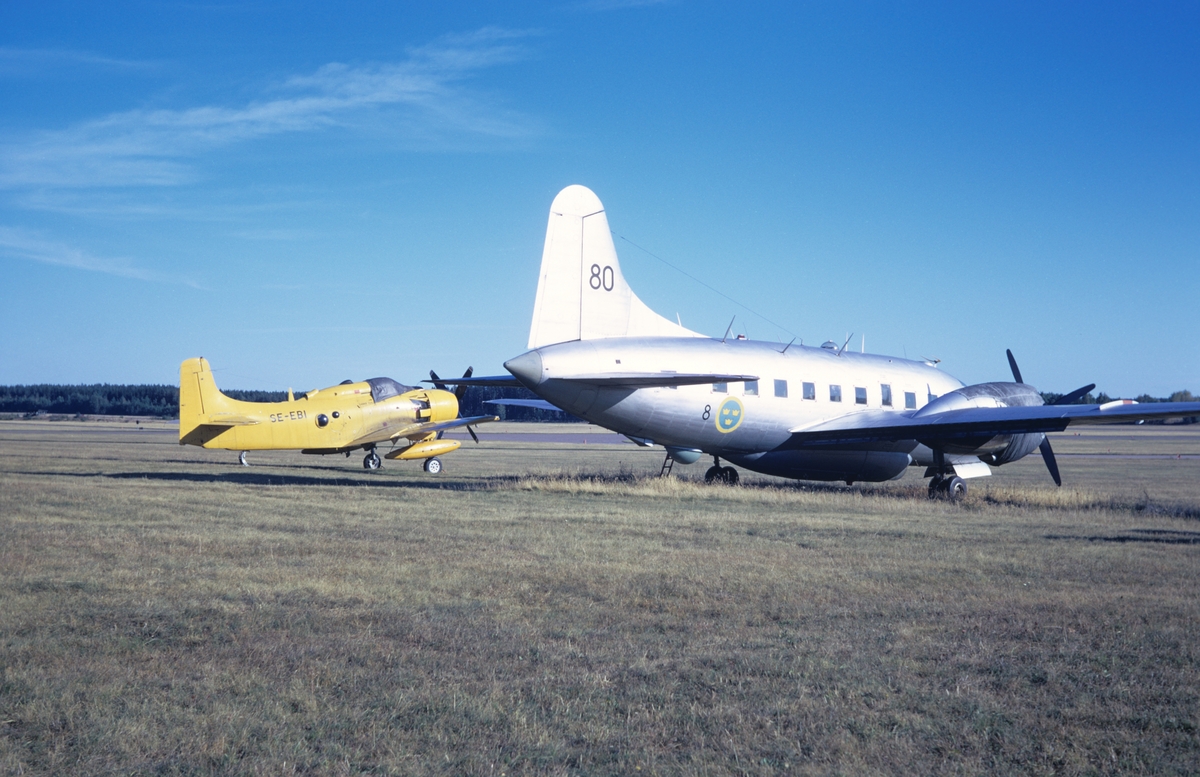 Civilregistrerat flygplan Douglas Skyraider AD-4W med märkning SE-EBI samt flygplan TP 82 001 märkt nummer 80 tillhörande F 8 Barkarby står på flygfältet på Malmen, hösten 1973. Serie om 2 bilder.