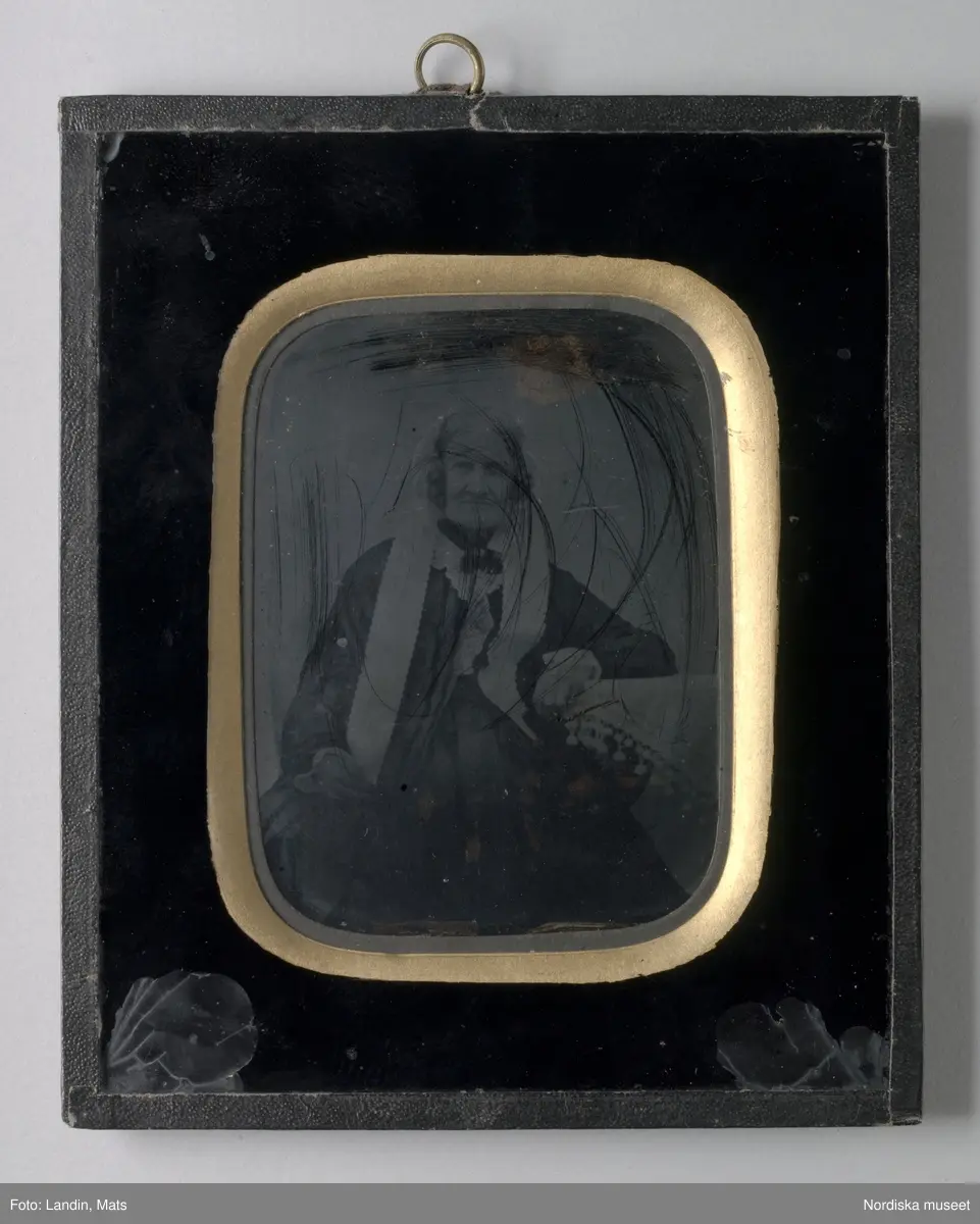 Porträtt av äldre kvinna, föreställer Johanna Christin Oxehufwud. Knästycke, sittande, en face. Mittbena, lockar vid öronen. Iklädd spetsmössa med breda hängande band, mörk krinolin med spetskrås och spetskrage, långärmad mörk kappa, spetsmanschetter. Ambrotyp i ram.