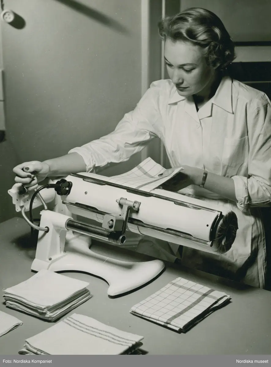 En kvinna manglar handdukar med hjälp av en strykmangel. Påskrift med blyerts på baksidan: "Brud i Hem 1951"