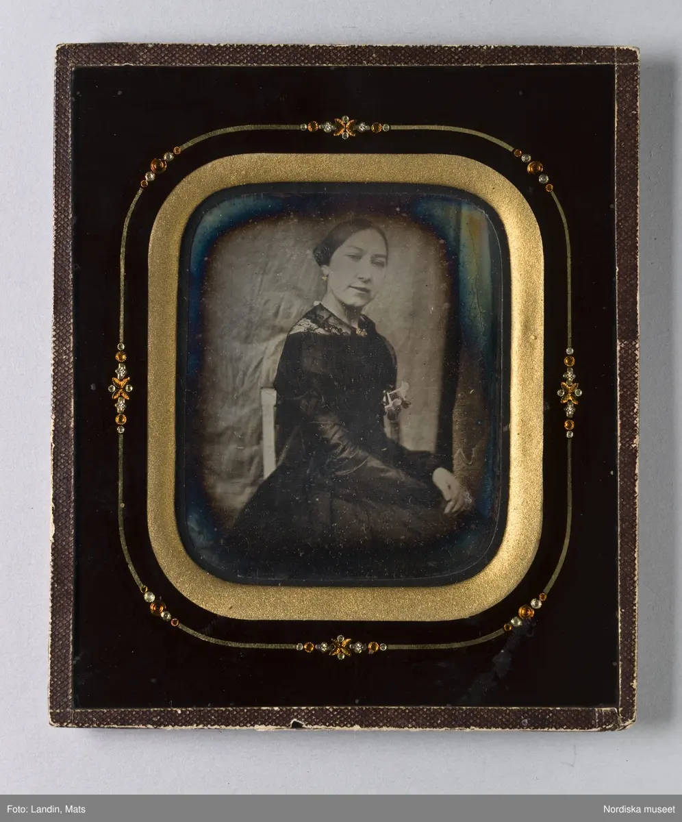 Damporträtt. Porträtt av fru Marianne Delander, f. Moberger, 1850-tal. Dagerrotyp / daguerreotyp i passepartout med förgyllda detaljer. Nordiska museet inv.nr 109723.