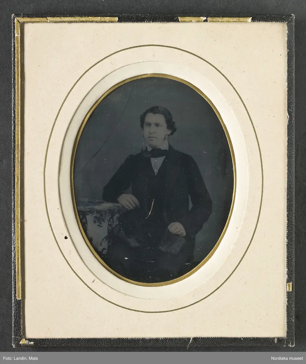 Ambrotyp i glasad ram. Bakstycke av grå papp med påklistrad vit etikett från W. A. Eurenius & P. L. Quists ateljé, Regeringsgatan 14, Stockholm.