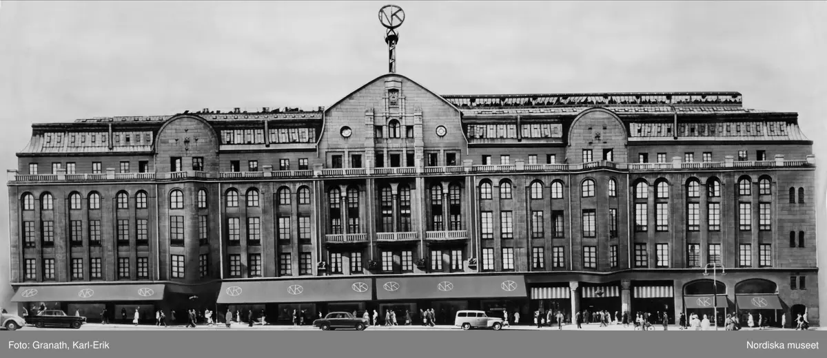 Titel: Nordiska kompaniets fasad mot Hamngatan i Stockholm. I förgrunden syns fotgängare och biltrafik. Högst upp, mitt i varuhuset ligger NK:s Franska damskrädderi med salong och provrum innan för det välvda fönstret och de två runda fönstren i frontespisen. Syateljén ligger vägg i vägg i lokalerna till vänster mot Regeringsgatan.