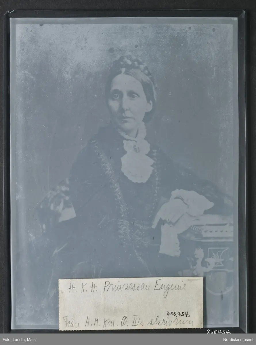 Porträtt av Eugénie, Prinsessa av Sverige och Norge (1830-1889), Sittande knästycke, kroppen vriden åt höger, ansiktet närmast en face. Mittbena, slätt hår kammat bakom öronen, samlat till flätad uppsättning ovanpå hjässan. Mörk krinolin med vertikala snörmakeriband framtill och kring de vida ärmarna. Spetsmanschetter och spetskrage, på kragen oval brosch med kors. Prinsessans h. arm vilar på litet bord, v. arm böjd framför kroppen, händerna hålls intill varandra vid bordsskivans kant.