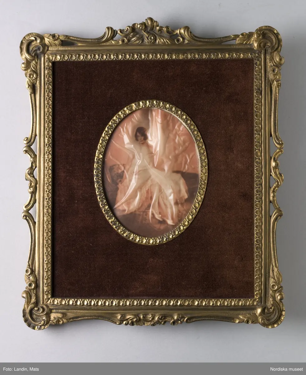 Porträtt, helfigursbild, sittande. Föreställer Eva Dickson. Klädd i vadlång spetsklänning med bara axlar och sidenskor med rosetter. Fotografi, rödbruntonat, i ram. Fotot innanför glaset täckt av tunn plastfolie som är mycket skrynklig.