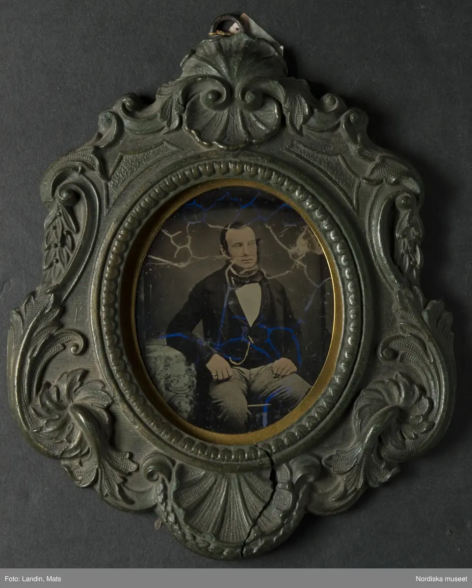 Porträtt av okänd man iklädd bonjour. Ambrotyp i skulpterad, glasad ram med oval dagöppning. Ambrotypens glas sprucket.