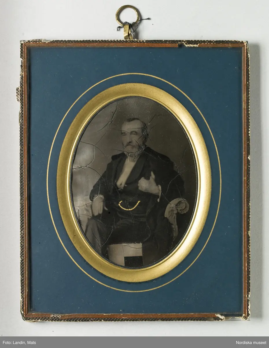 Porträtt av äldre man. Föreställer urboettmakaren Anders Wilhelm Åberg född 9/4 1803, död 3/11 1866, Stockholm. Förgylld klockkedja. Panotyp i ram.