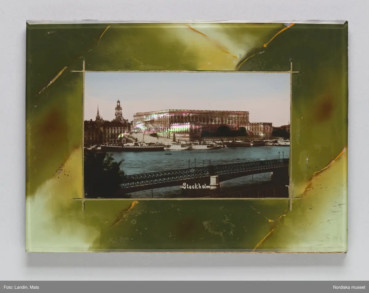 Stockholms slott överfört på glasplatta, stadsvy som visar Stockholms slott från Skeppsholmssidan. Hela bilden handkolorerad. Slottet och byggnaderna vid Skeppsbron pärlemorskimrande. Längst ned, i mitten av bilden, "Stockholm" målat i vitt.