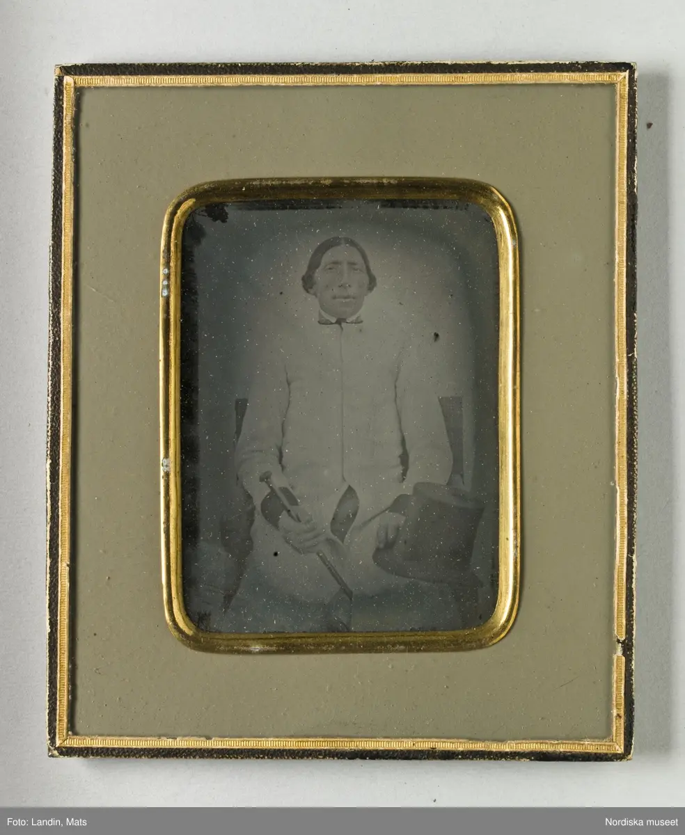 Porträtt av sittande man. Föreställer Lars Olsson från Västra Vingåkers socken, Oppunda härad, Södermanland. Mittbenat hår, iklädd ljus rock med mörka manschetter. I höger hand käpp. På vänster knä ligger hans höga hatt. Ambrotyp i ram