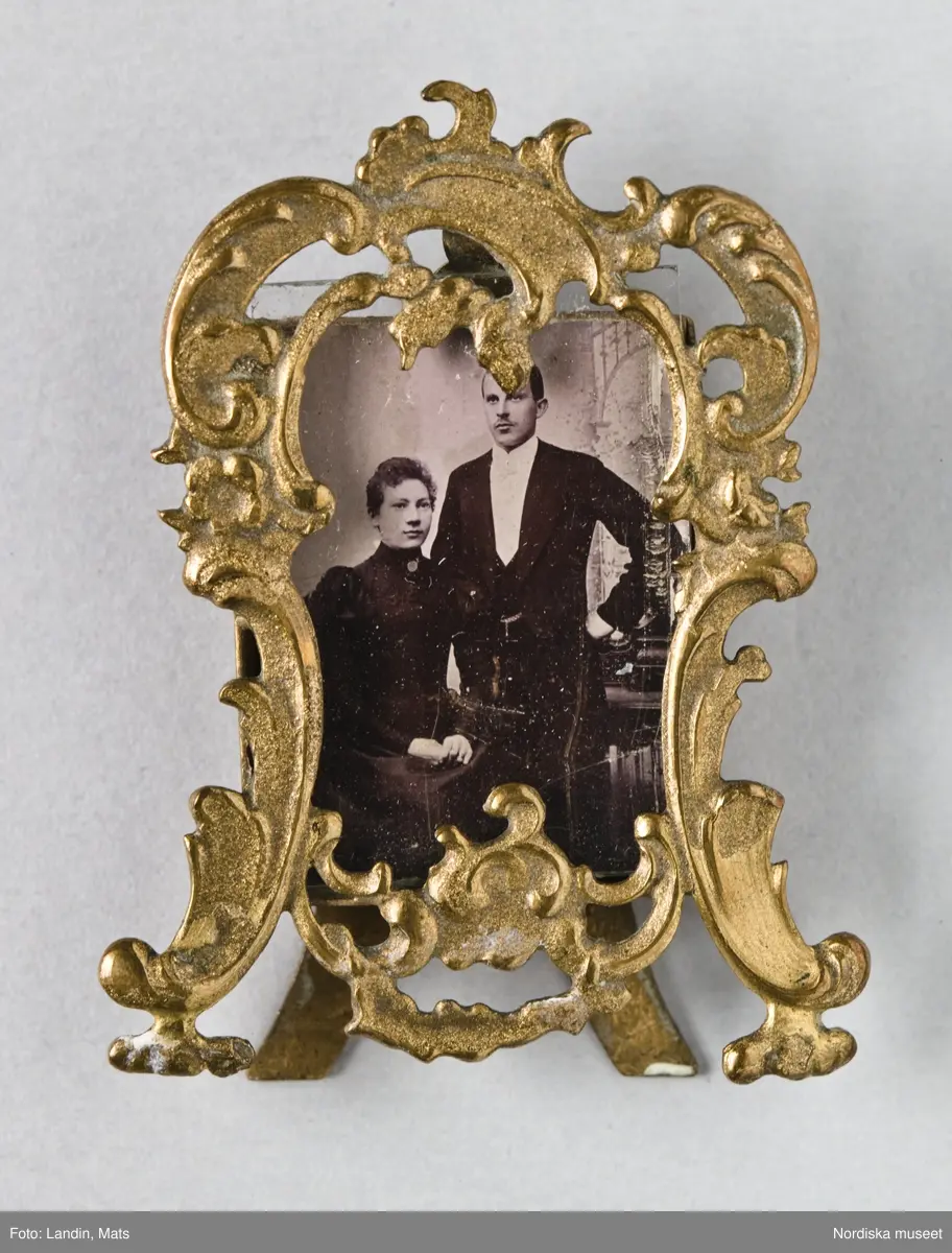 Bröllopsfoto med utsirad, genombruten ram i gulmetall. Föreställer Agnes och Allan Spak, Stockholm. Han står, hon sitter iklädd svart klänning. Nordiska museet inv.nr 285228B.