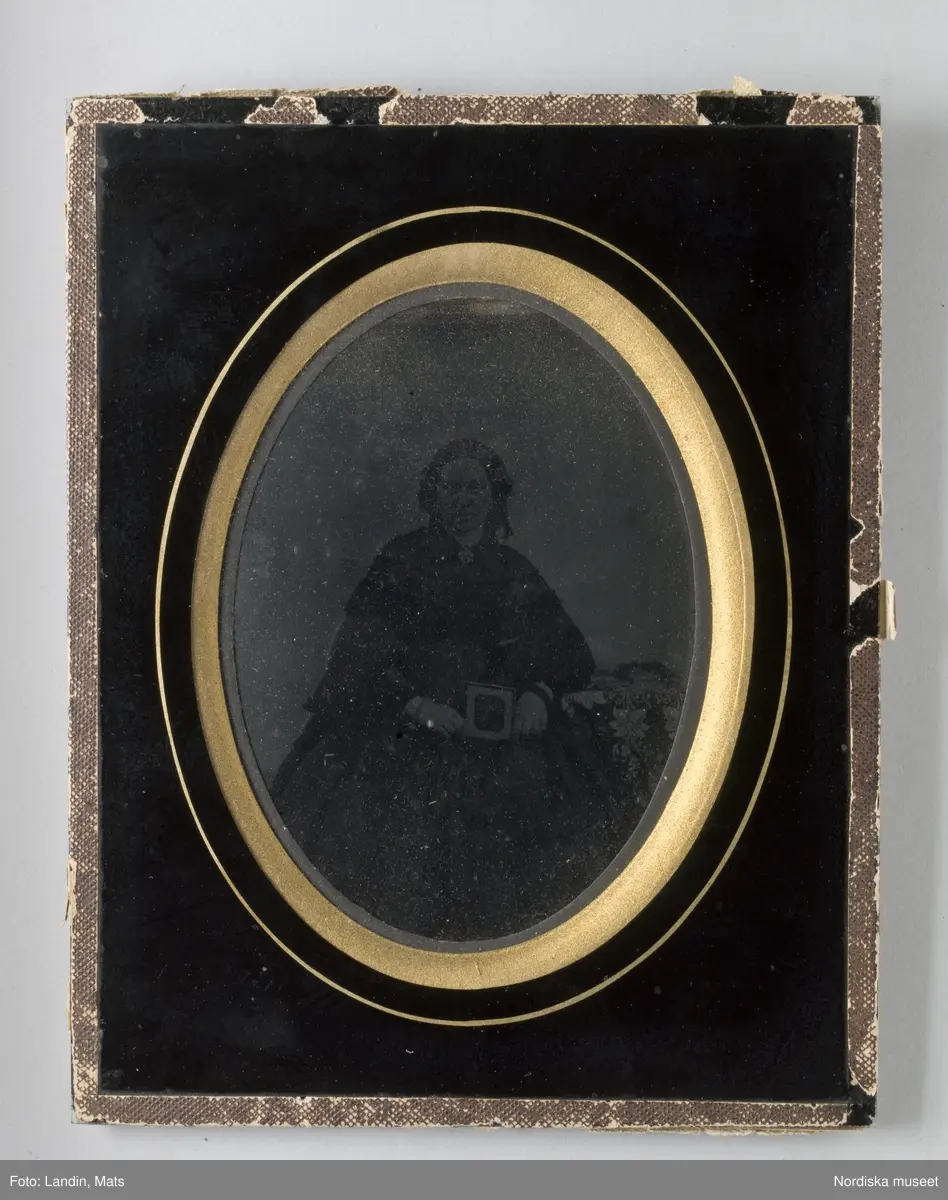 Kvinnoporträtt, enligt påskrift Johanna Catharina "Kitty" Oxehufvud född Melin (18101874). Närmast helfigur sittande en face. Mittbenat uppsatt hår, svart långärmad krinolin, brosch i halsen, armband och ringar. I knäet hålls en dagerrotyp/ambrotyp med motivet vänt mot fotografen. Ambrotyp i ram, Nordiska museet inv.nr 314083.