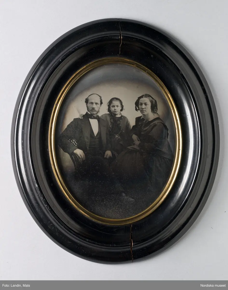 Porträtt, gruppbild. Familj, far och mor sittande, mellan dem stående dotter. Ambrotypi i oval svarvad svart ram med inre mässingslist, glas. Ca 1860. Liten etikett fastklistrad på baksidan med tryckt text: "J. F. Dabelsteen, Photograph."