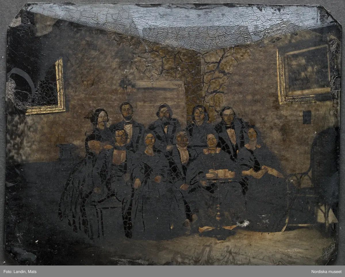 Grupporträtt i heminteriör. Föreställer grosshandlare Johan Lundgren med familj i Göteborg. Familjemedlemmarna sittande i borgerlig miljö. Samtliga personer klädda i mörka kläder. Bilden starkt retuscherad, handkolorerad och förgylld. Bilden tagen 1859 av fotografen S.L. Rydholm, Sillgatan 41, Göteborg