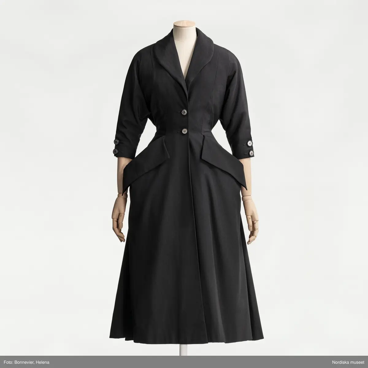 Svart kappklänning med smal midja och vid kjol i New Look-stil. Efter Dessès. Beställd på NK:s Franska damskrädderi av friherrinnan Margit von Essen född Amundson (1892-1994). Levererad våren 1949.