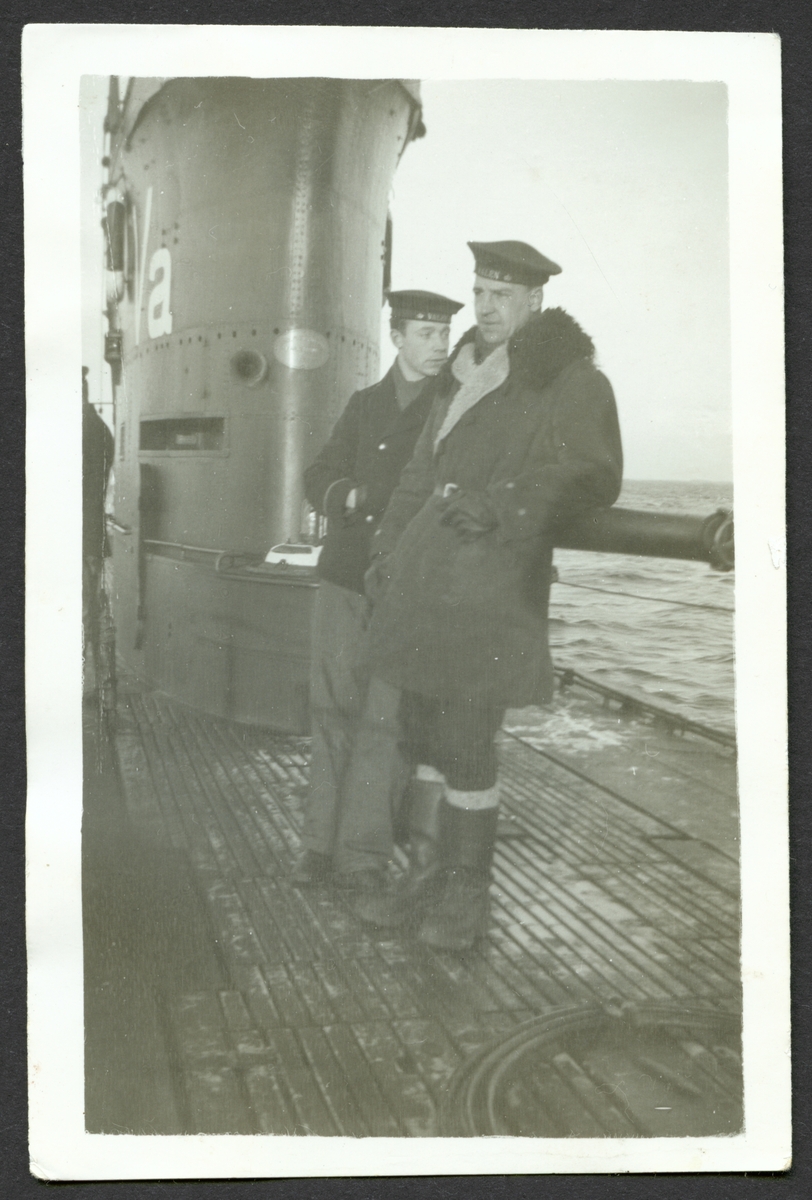 Bilden föreställer två sjömån som står på däck av ubåten Valen och lutar sig mot kanonen.