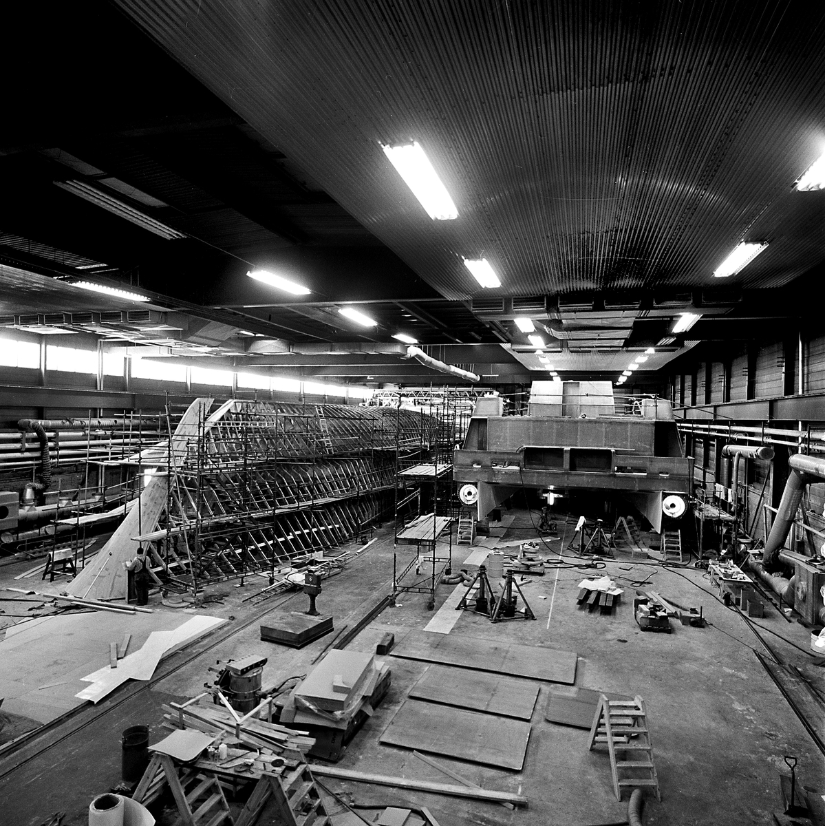 Plastverkstaden 1987. Till vänster ribbspantformen till skrovet för minröjningsfartyg typ Landsort. Till höger en plastfärdig sidokölsvävare- ett