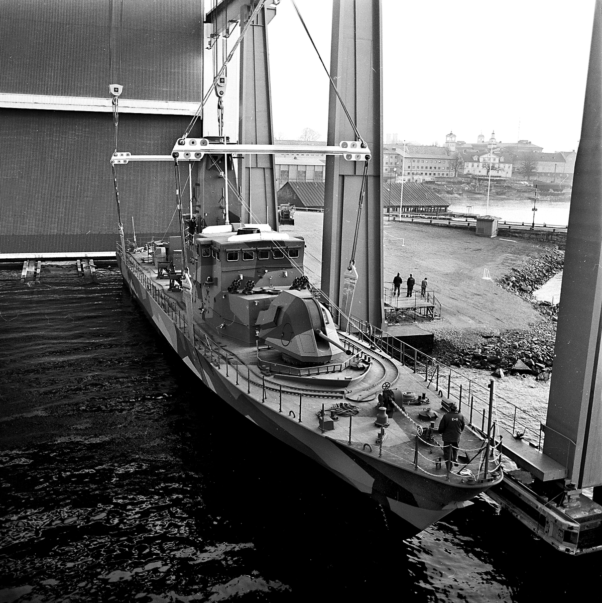 Kustkorvetten Göteborg, hängande i traveser utanför skrovhallen dagen före sjösättningen 1989.