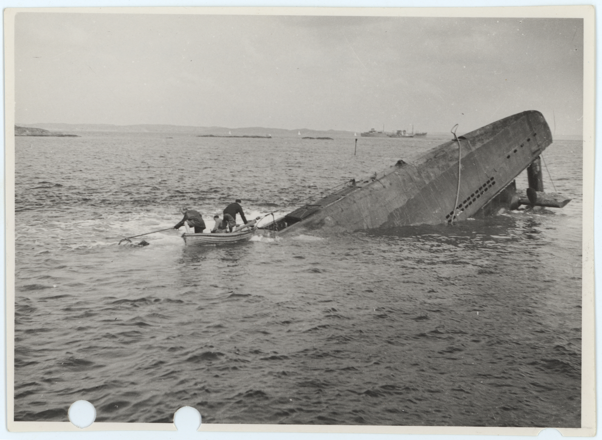 Titel: Bilden visar akterstäven av den tyska ubåten U 3503 flyter upp till ytan under bärgningen. En småbåt med flera sjömän hjälper dykaren som lyckades håller sig fast vid ubåten under uppstigningen.