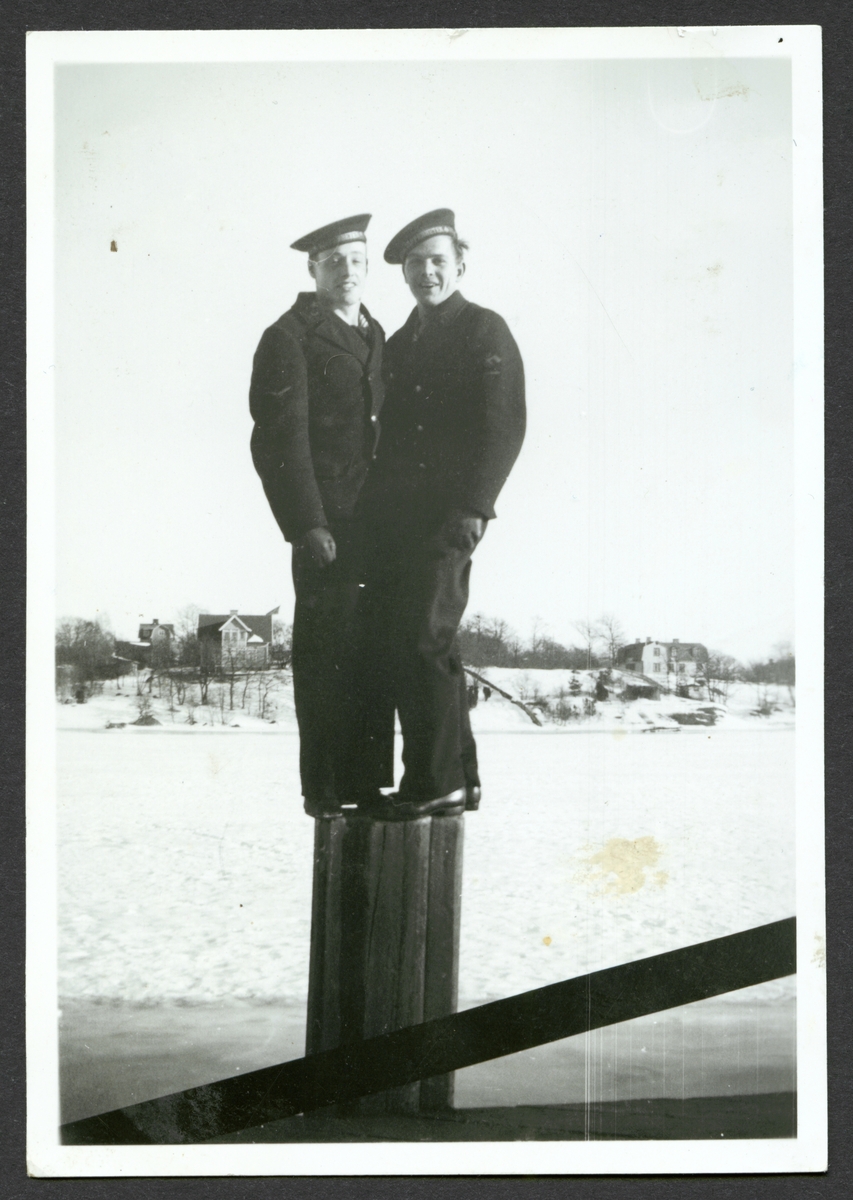 Bilden visar två sjömän som står på en pål. Havet i bakgrunden är istäckt.