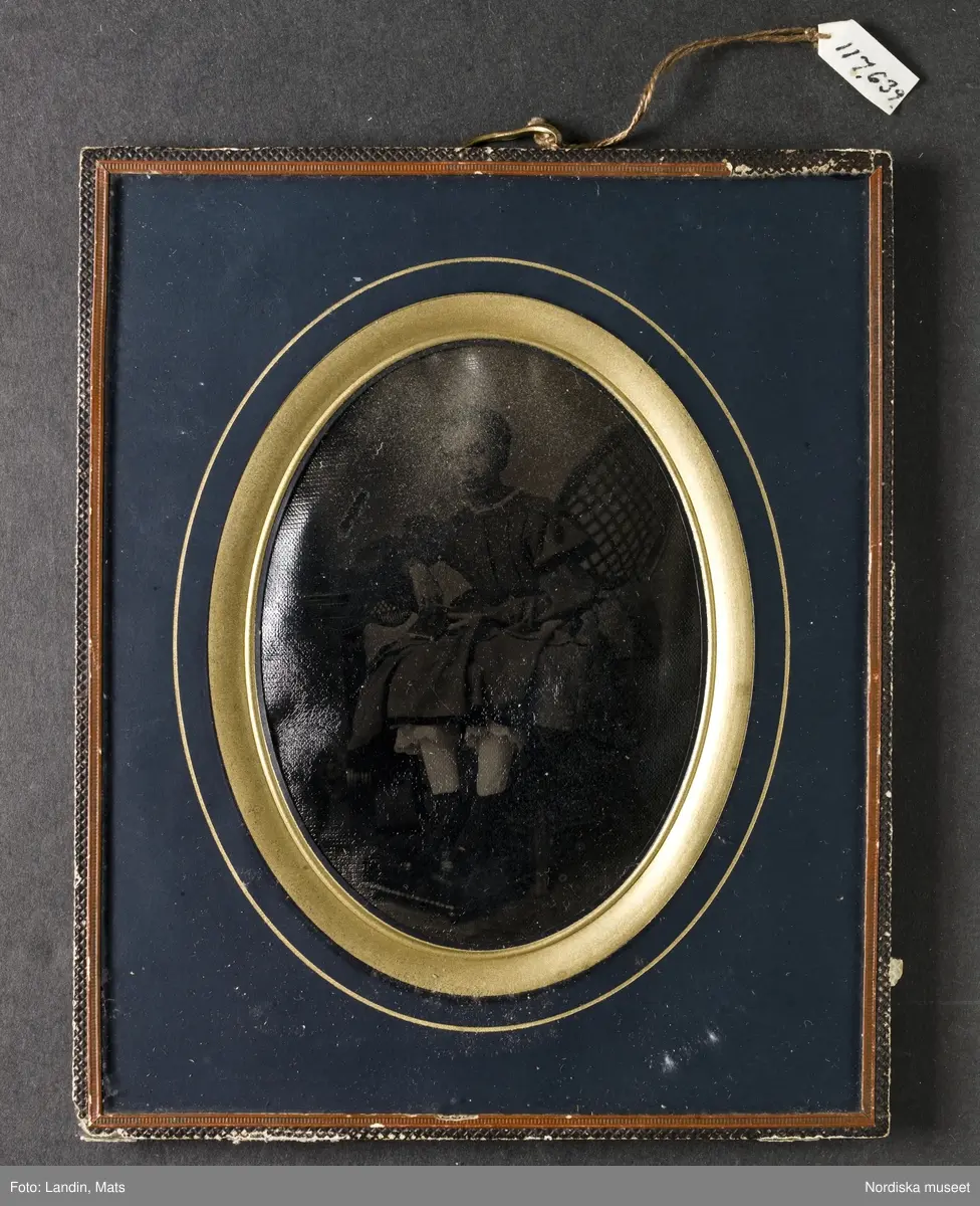 Panotypi, flickporträtt från 1860-talet. Flicka sittande i korgfåtölj, klädd i klänning, vita mamelucker, vita strumpor och svarta kängor. Nordiska museet inv.nr 117639.