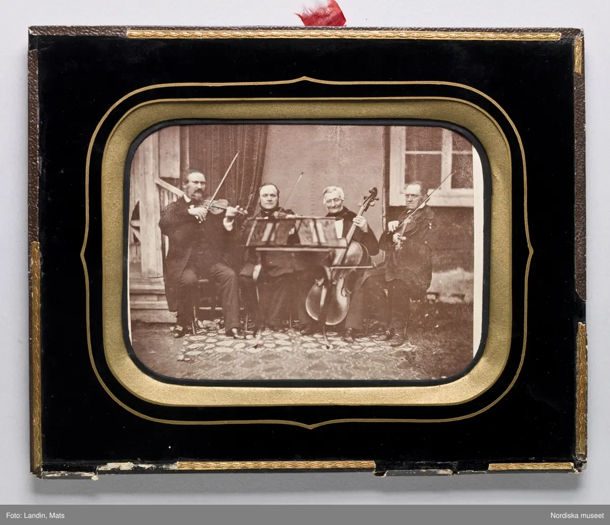 Fotografi i ram, trol. 1860-tal, porträtt av stråkkvartett; fyra män sittande utanför litet hus. På ramens bakstycke skrivet med blyerts: "En kvartett från Säter/ Södergren Prosten/Arosin Bergsfogde/Hedin (?) /Osquist/....".