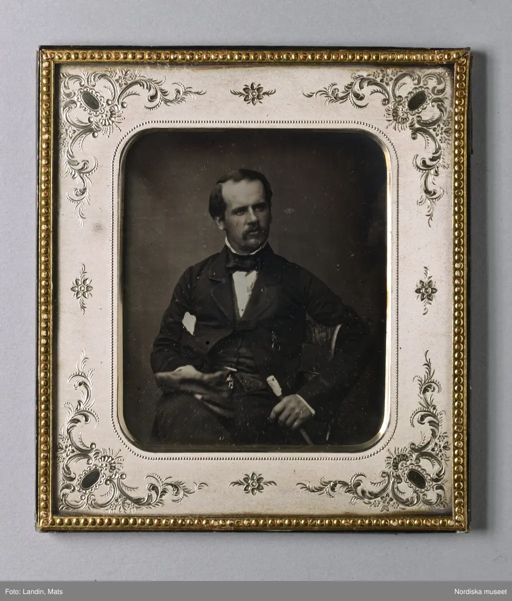 Knäbild av sittande man. Dagerrotyp / daguerreotyp i ram av sidenpressat papper under glaset, guldpapperslist utanpå detsamma. På baksidan etikett med tryck: "G. Renard/ Daguerreotypeur/ in Kiel/Klinke No 30 u. 31." Handskriven text: "En gärd af vänskap och försoning/Till frid uti vår gamla boning. /Till Fanny Staaf/från hennes bror/Pehr Staaff/Paris den 27 Juni 77." Nordiska museet inv.nr 264611