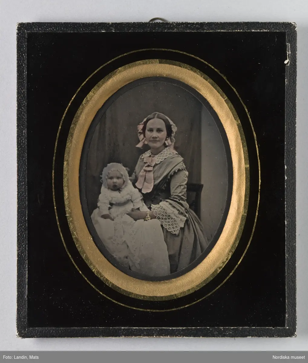 Dubbelporträtt av kvinna och barn. Ambrotypi, handkolorerad. Nordiska museet inv.nr 111257.