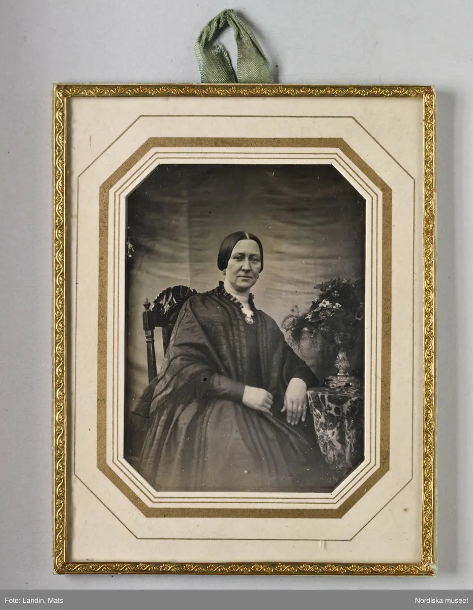 Porträtt av Johanna Catharina "Kitty" Oxehufvud född Melin (18101874). Sittande i stol med högt ryggstycke. Mittbena, slätt hår uppsatt baktill. Klädd i mörk krinolin och kappa av sidenmoiré med vida ärmar och spets kring öppningen. Örhängen, ring på vänster ringfinger och brosch framtill på klänningen. Lutar sin vänstra arm mot litet bord med blomsteruppsättning i vas. Dagerrotyp / daguerreotyp i ram.