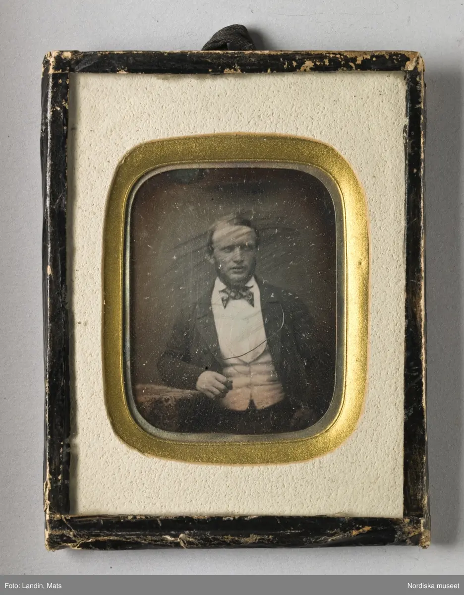 Porträtt av okänd man med skägg, sittande, iklädd svart frack, vit väst, vit skjorta och mönstrad halsduk. Dagerrotyp / daguerreotyp i ram. Nordiska museet inv.nr 223384