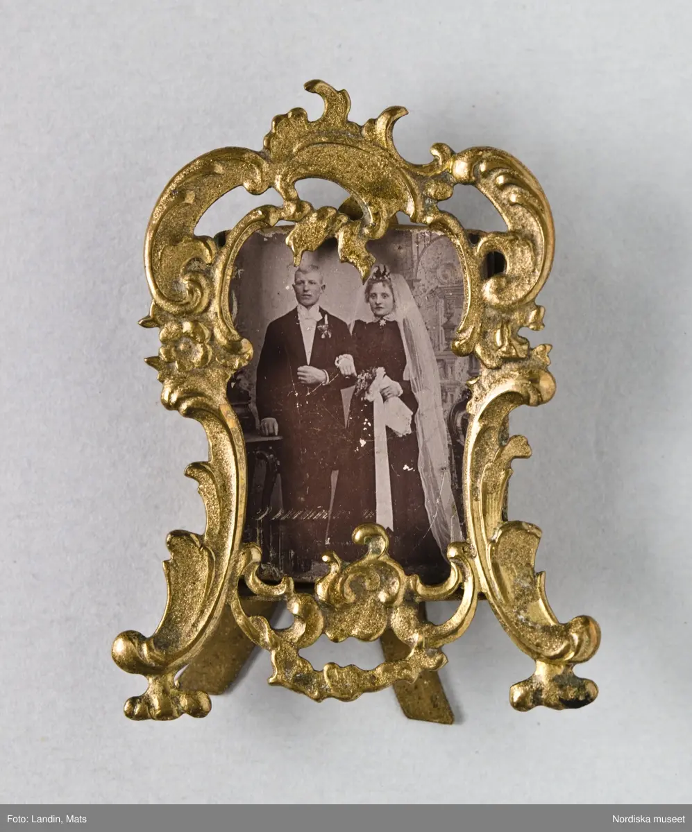 Bröllopsfoto med utsirad, genombruten ram i gulmetall. Föreställer Hilma och Edvin Jonsson, gifta 1895. Hon i svart brudklänning med vit slöja