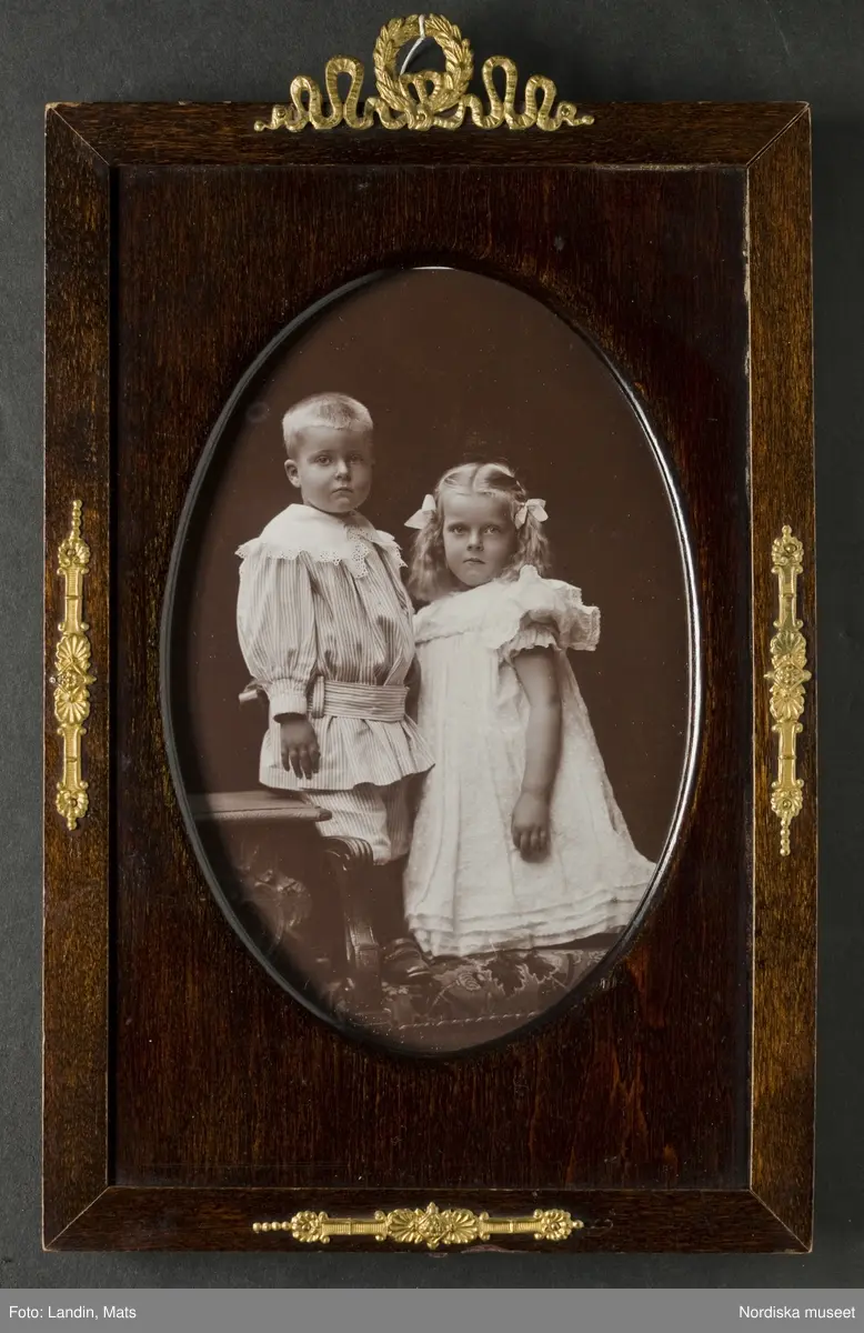 Fotografi i ram, porträtt av två barn, en pojke i 3-4-årsåldern och en flicka i 5-6-årsåldern, helfigur. Pojken t.v., stående på länstol, klädd i ljusrandiga byxor, skjorta och stor vit brodyrkrage. Flickan, sittande på knä i stolen, klädd i ljus, kortärmad klänning med puffärm och rosetter i håret. Fotografiet med blyertspåskrift: "1900". Nordiska museet inv.nr 255603.