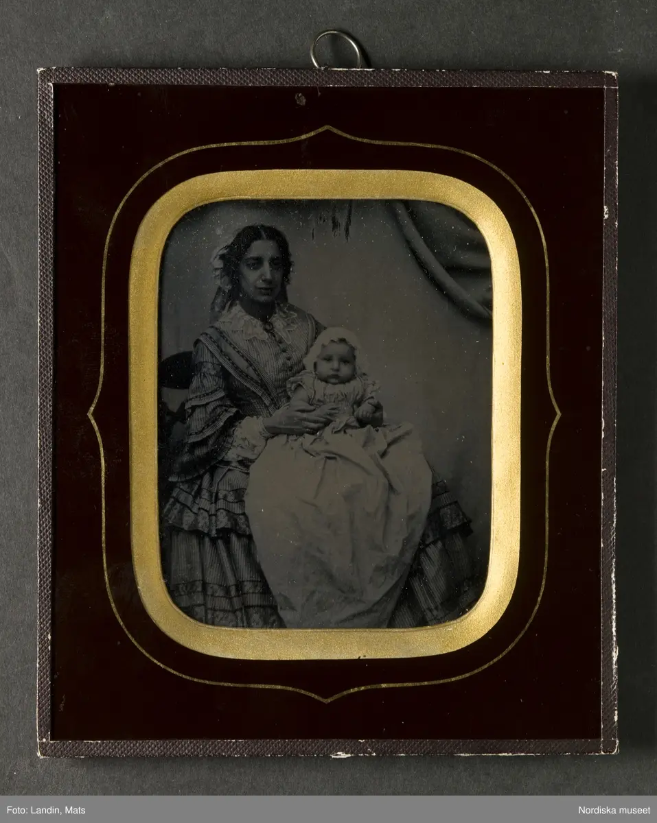 Ambrotyp i ram, porträtt av mor med liten dotter. Föreställer enligt huvudliggaren fru Ida Salomon, f. Jacobson (1828-1863) och Fanny Salomon, g. Hirsch (1856-1880). Modern klädd i klänning med vid kjol, ärmar med volang och vit underärm, vit krage och band i håret. Dottern i vit klänning och mössa. Nordiska museet inv.nr 257829b.