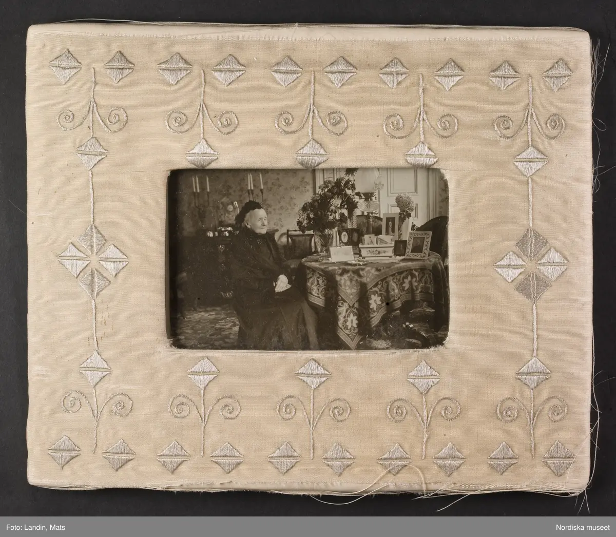 Fotografi i ram, porträtt av äldre dam i högborgerlig hemmiljö, ca. 1900. Kvinnan sittande, klädd i svart klänning och svart liten hätta på huvudet. Till höger ett runt bord med storblommig duk belamrat med familjeporträtt, en fotogenlampa och blommor i kristallvaser. Bakom kvinnan en byrå i rokokostil med kandelabrar och ett bordsur. Porträttet med invnr. 237486 står på bordet. Nordiska museet inv.nr 237487.