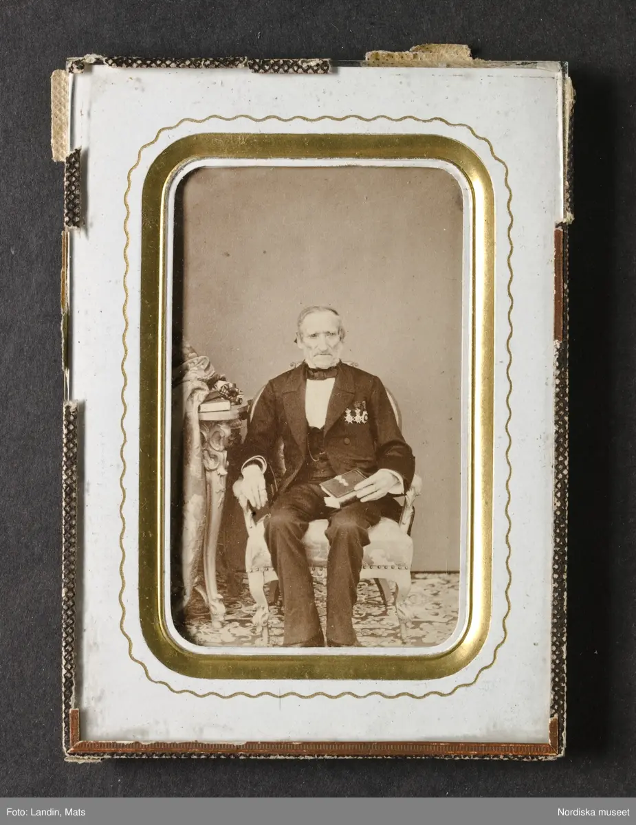 Porträtt av okänd, äldre man. Sittande iklädd bonjour med 3 ordnar, väst, med bok i ena handen. Fotografi i ram, porträtt i visitkortsformat. Nordiska museet inv.nr 185543.