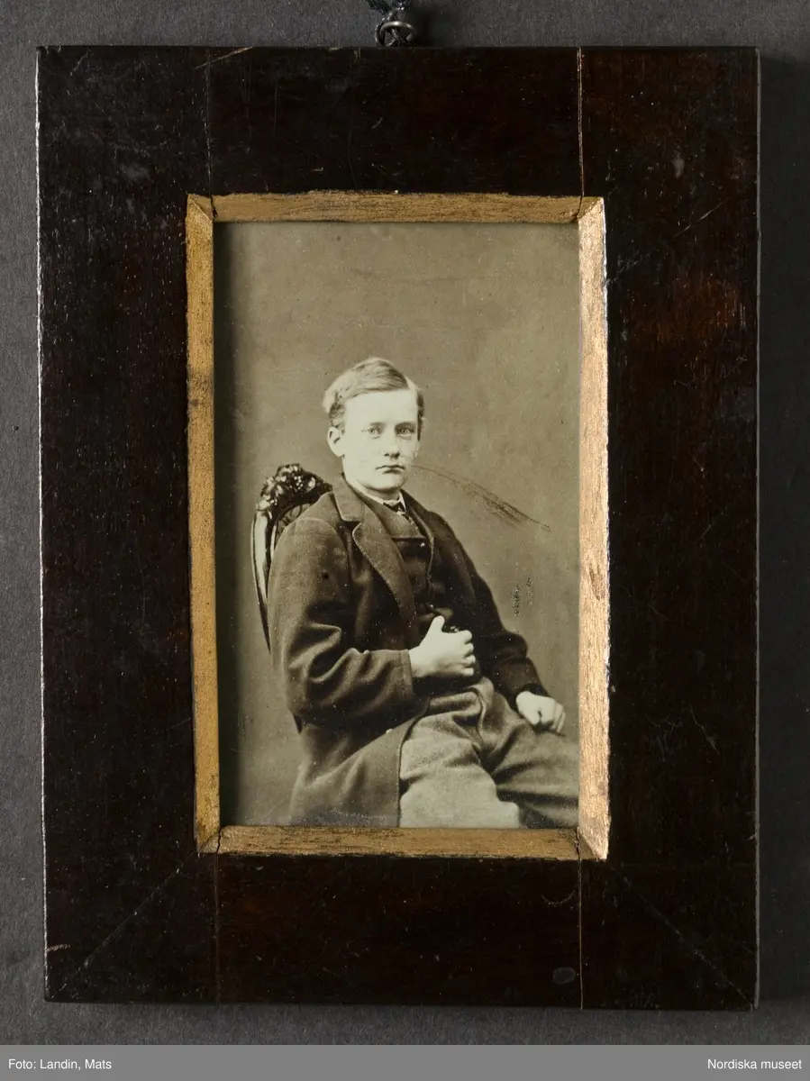 Porträtt av okänd sittande pojke. Fotografi i ram.