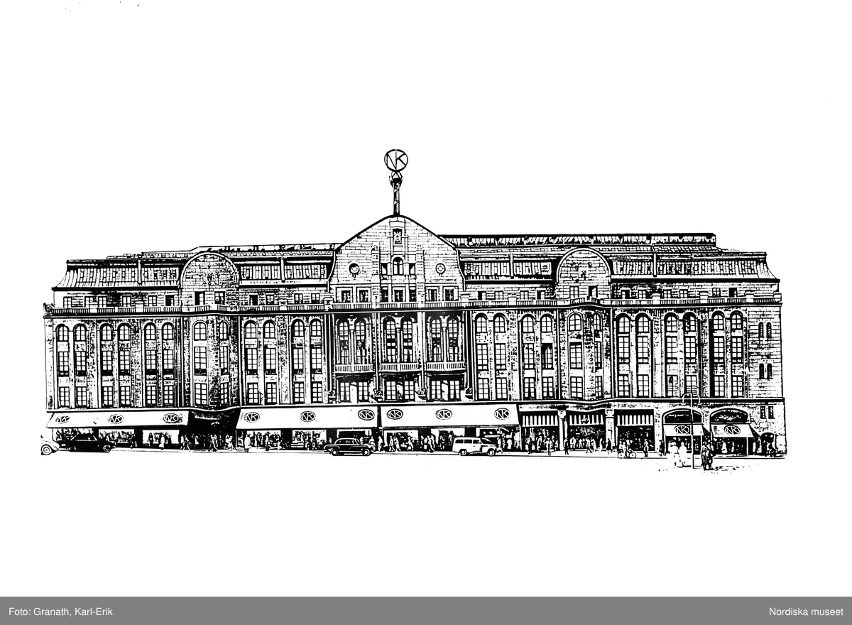 Nordiska kompaniets fasad mot Hamngatan i Stockholm. I förgrunden syns fotgängare och biltrafik. Högst upp, mitt i varuhuset ligger NK:s Franska damskrädderi med salong och provrum innan för det välvda fönstret och de två runda fönstren i frontespisen. Syateljén ligger vägg i vägg i lokalerna till vänster mot Regeringsgatan.