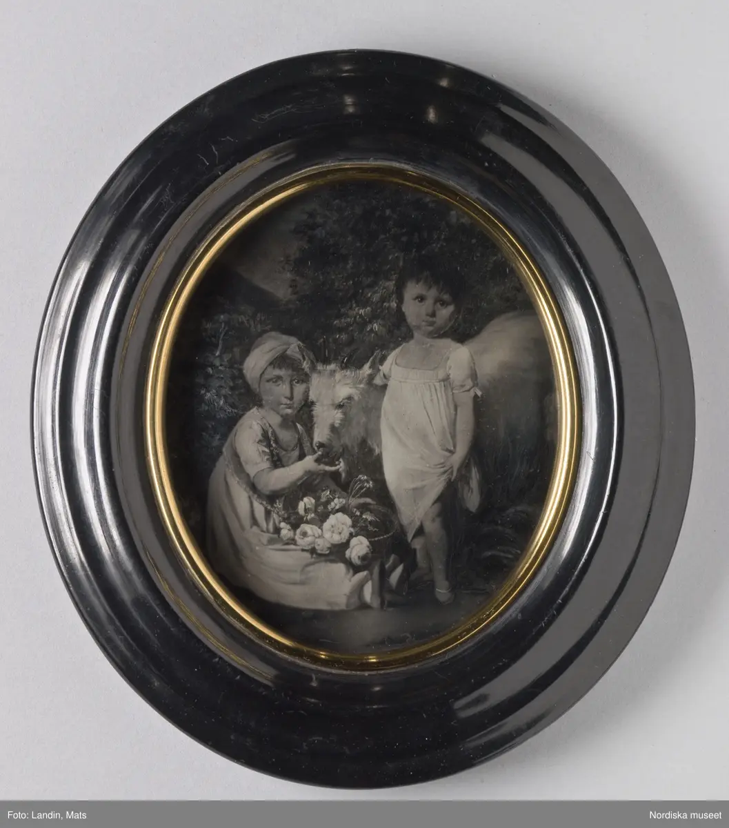 Barnporträtt. Reproduktion av målning. Två småbarn och en get. Ambrotypi. Nordiska museet inv.nr 15594.