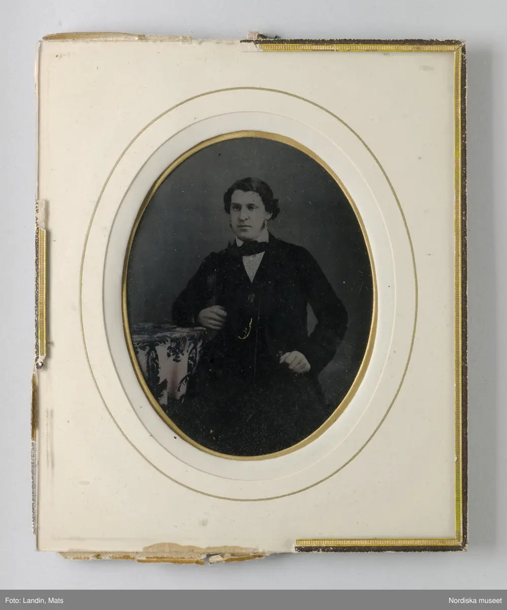 Porträtt av okänd ung man. Ambrotyp i ram. Tryckt etikett på baksidan "W. A. EURENIUS & P. L. QUIST/FOTOGRAFISK ATELIER./Stockholm /Regeringstagan No 14".